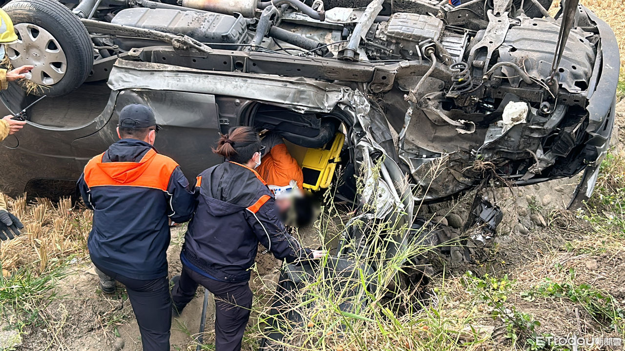 ▲雲林庇護工場交通車翻落田中四腳朝天,車頂嚴重變形。(圖/記者蔡佩旻攝)
