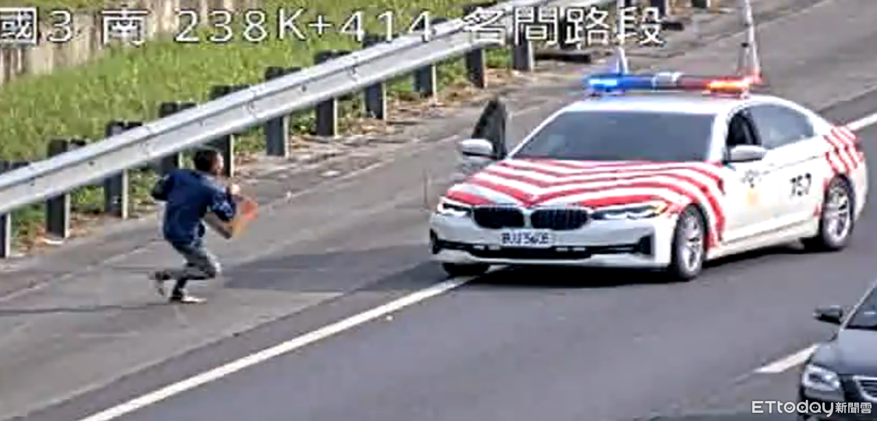 當警方開著紅斑馬出現時,男子立刻將紙箱一丟,橫跨車道後跑往對向,員警急忙站在中間的防眩板上揮手讓車輛停下,怎知男子又繼續朝路邊跑去,險些挨撞,再翻出護欄跑進草叢內,一旁正在施工的人員見狀趕緊上前幫忙,終將該名男子逮捕壓制。