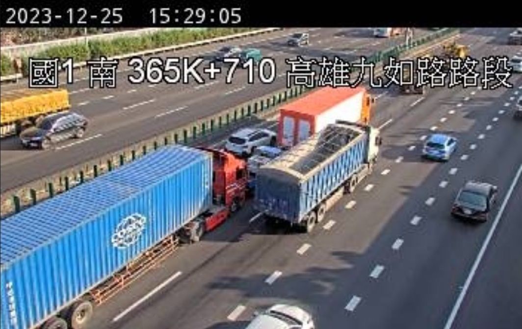 國道1號南向365.7公里處(高雄九如路路段),25日下午2時57分發生一起車禍!三輛聯結車跟一部小貨車因不明原因發生追撞,整起事故佔用中間車道。警方獲報後趕赴現場處理,後方車流回堵約7公里,至於詳細事故發生原因及經過,仍有待警方進一步調查釐清。