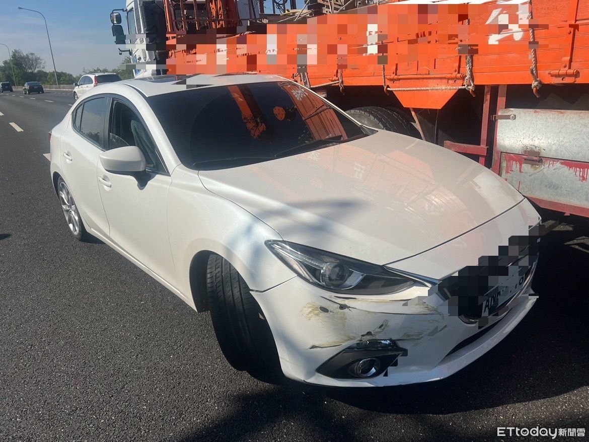 ▲國道1號南向289.3公里台南新營路段,12月24日上午發生交通事故案,25歲蕭姓男子駕駛自大貨車疑似因變換車道不當,撞擊37歲蕭姓男子駕駛自小客車肇事。(圖/記者林東良翻攝,下同)