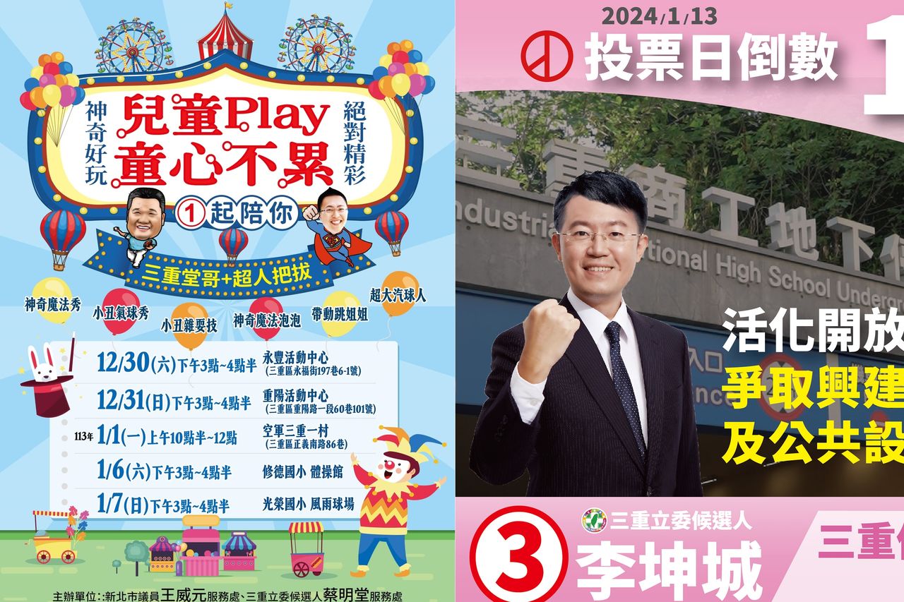 2024選舉進入最後階段,各區立委候選人紛紛上緊發條賣力拉票。新北第3選區(三重區103個里)國民黨候選人蔡明堂預告將舉辦跨年活動,與新北市議員王威元共同邀請鄉親同樂。對手李坤城則端出政見,主張活化閒置國有地,緩解停車問題。無黨籍候選人陳東雲則說明參選原因。