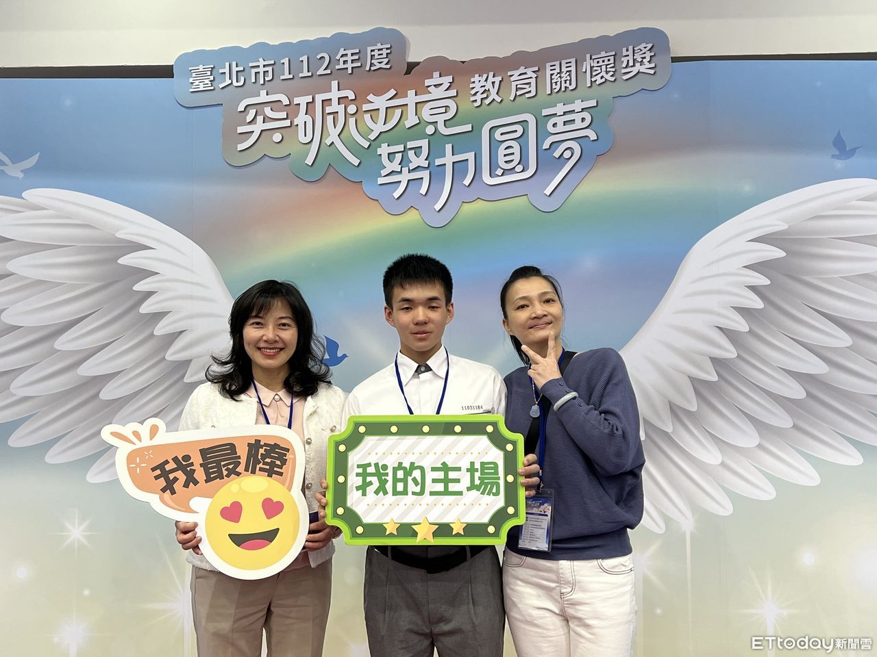 ▲北市龍門國中學生劉軒丞(中)獲頒教育關懷獎,開心和父母合影。(圖/記者楊惠琪攝)