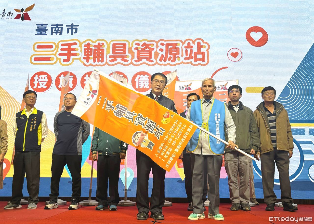 ▲台南市長黃偉哲,在社會局盧禹璁局長陪同下授旗給各二手輔具資源站,持續提供優質便民的輔具服務。(圖/記者林東良翻攝,下同)