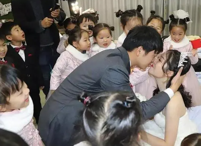 據《中國新聞網》報導,12月26日,浙江寧波。幼兒園兩名老師結婚,把婚禮辦到了幼兒園裡面,孩子們參加了婚禮的儀式部分,他們各個都穿著紅色的衣服,有的舉著迎親牌,有的「抬小花轎」。新娘在所帶班級完成出閣禮,鳳冠霞帔地等待新郎來接親。