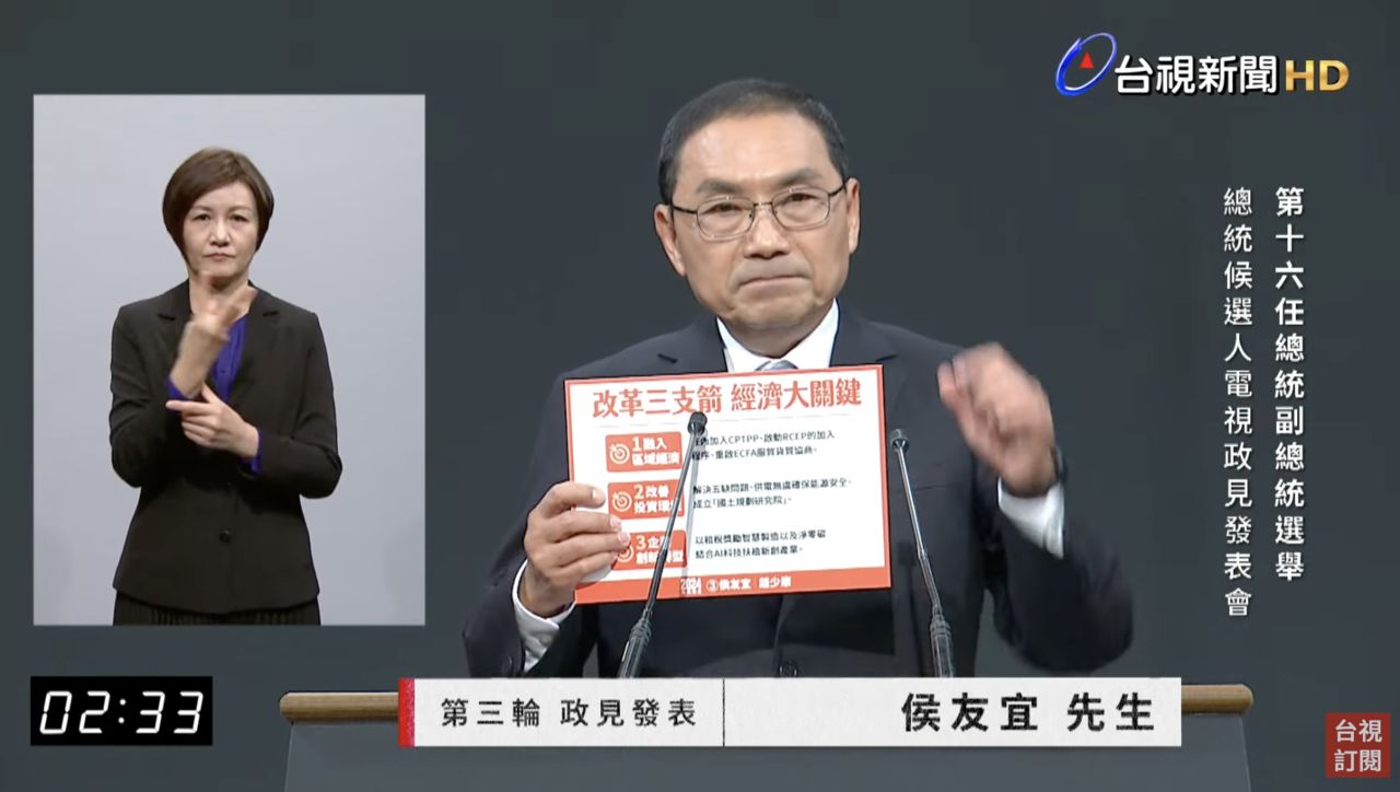最後一場總統候選人電視政見發表會今(28)日晚登場,國民黨總統候選人侯友宜在最後一輪的談話以「經濟」來談。侯友宜先批民進黨經濟創14年新低,並提出「改革三支箭經濟大關鍵」,包括,區域的經濟要趕快融入、改善投資環境、企業要創新轉型。