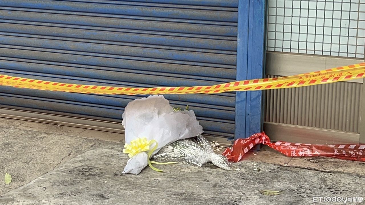 ▲致哀花束就放在一樓的鐵門前、封鎖線後。