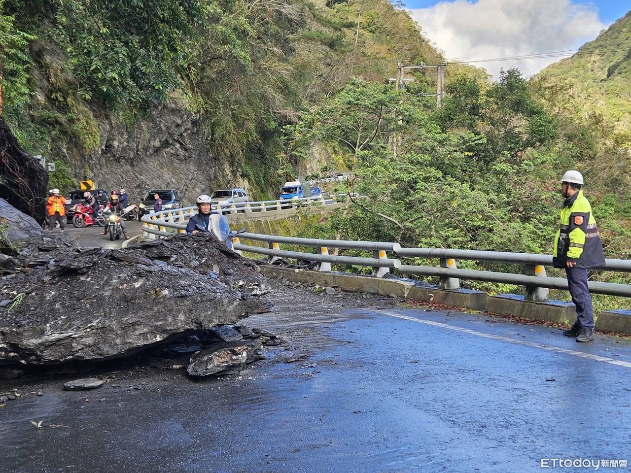 台東縣海端鄉台20線利稻路段今早發生邊坡坍方,有巨岩掉落路上,阻斷雙向道路,經關山工務段搶修,目前已搶通單線道路。