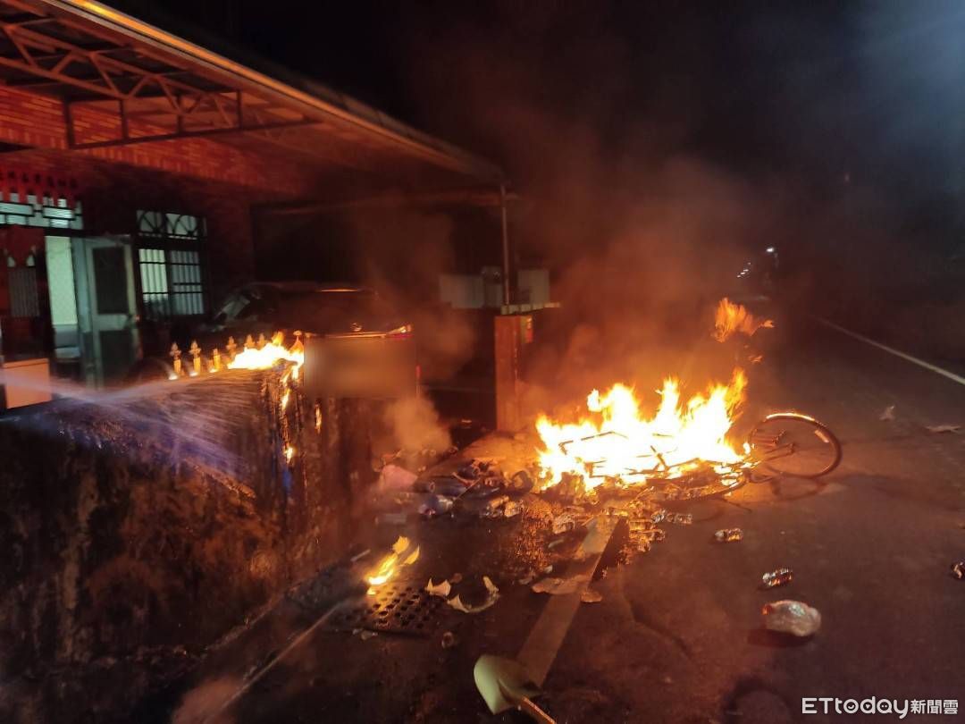 ▲高雄男在自家門口前燒廢棄物,還擋消防員滅火,恐被以公共危險罪移送 。(圖/記者吳奕靖翻攝)