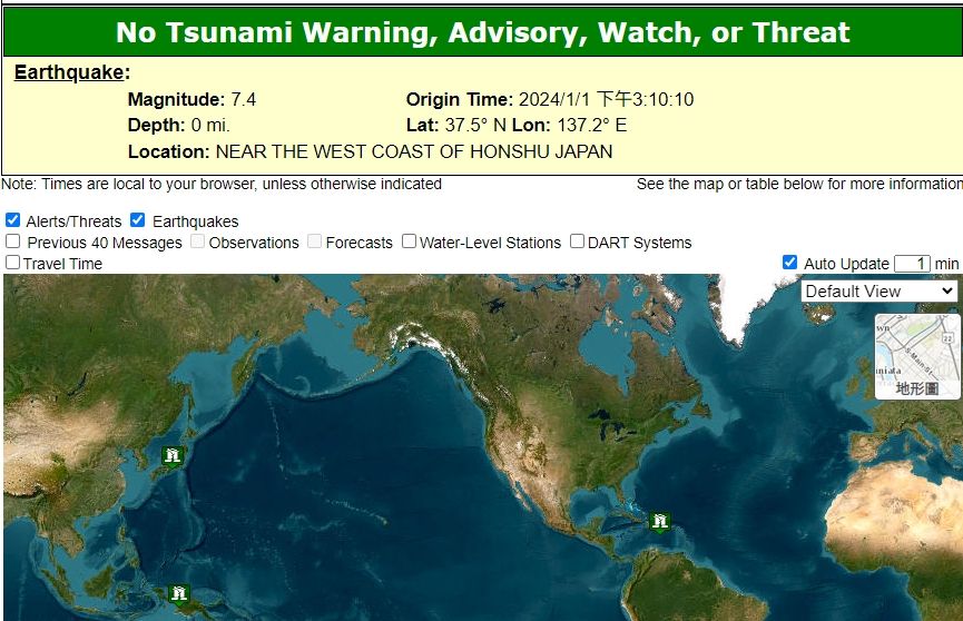 日本石川縣能登地方當地時間今天下午4時許接連發生地震,最大規模7.6。日本氣象廳原本對能登地區發布海嘯高度3公尺以上的「大海嘯警報」,於晚間8時30分降級為1公尺到3公尺間的「海嘯警報」。