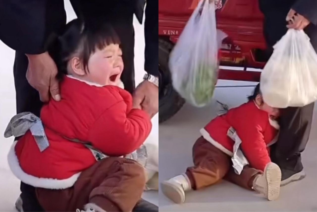 影片中,穿著紅色外套的小女孩坐在地上,抱著爺爺的腿大哭,滿臉的委屈及難過。爺爺俯下身安慰她,卻怎麼哄都止不住孫女的淚水。一旁爺爺的母親看不下去,心疼不已,揮著手中的藍色拐杖向兒子喊去,「你趕緊去買!」