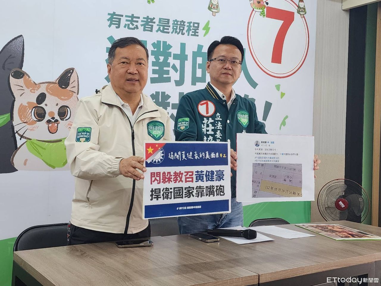 莊競程今(2)日在競選總幹事、市議員曾朝榮陪同下,召開記者會。莊競程表示,黃健豪2023年的4月10日在臉書發了貼文說,中共軍演,他收到了教召令,還酸民進黨出張嘴,他來守護中華民國。但實際上,黃收到教召令後先發文做新聞,博取好感,意圖讓大家覺得他會捍衛中華民國,事實上卻躲避教召,有知情民眾看不下去向莊競程爆料。莊競程砲轟黃健豪「如果你是要像你嘴巴講的守護中華民國,那真的教召令來的時候,為什麼要躲避教召?」