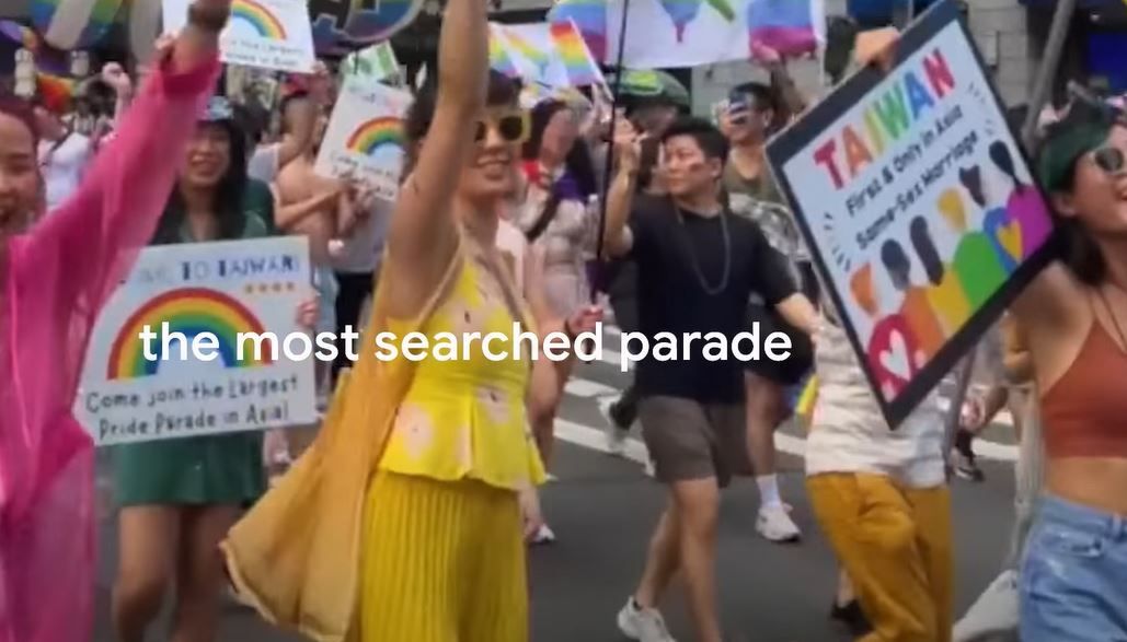 這段畫面的出處是婚姻平權遊行,遊行的民眾手舉「TAIWAN」的告示牌,這段影像被記錄下來,也讓全世界看到台灣當時爭取婚姻平權的過程。