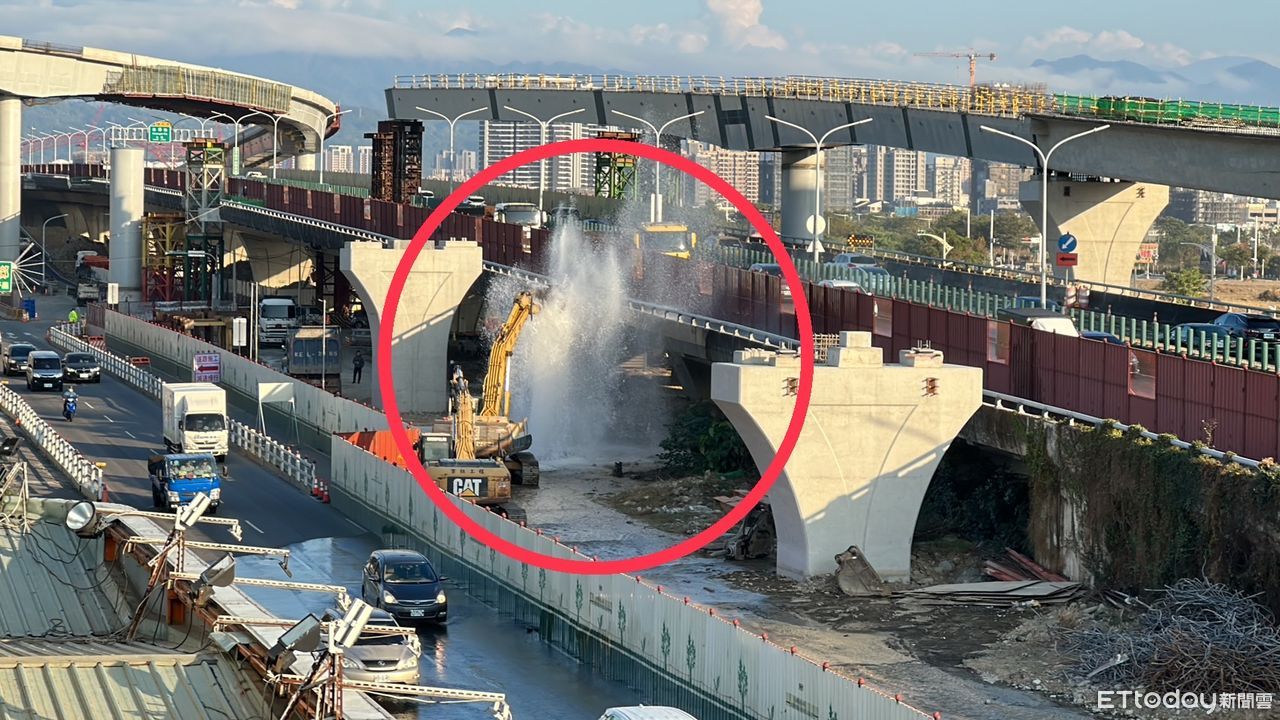 ▲▼國1新增大雅交流道工程,今日傳出施工意外,一輛怪手撞斷台水洩壓閥,導致大量自來水噴出如湧泉。(圖/記者許權毅攝,下同)