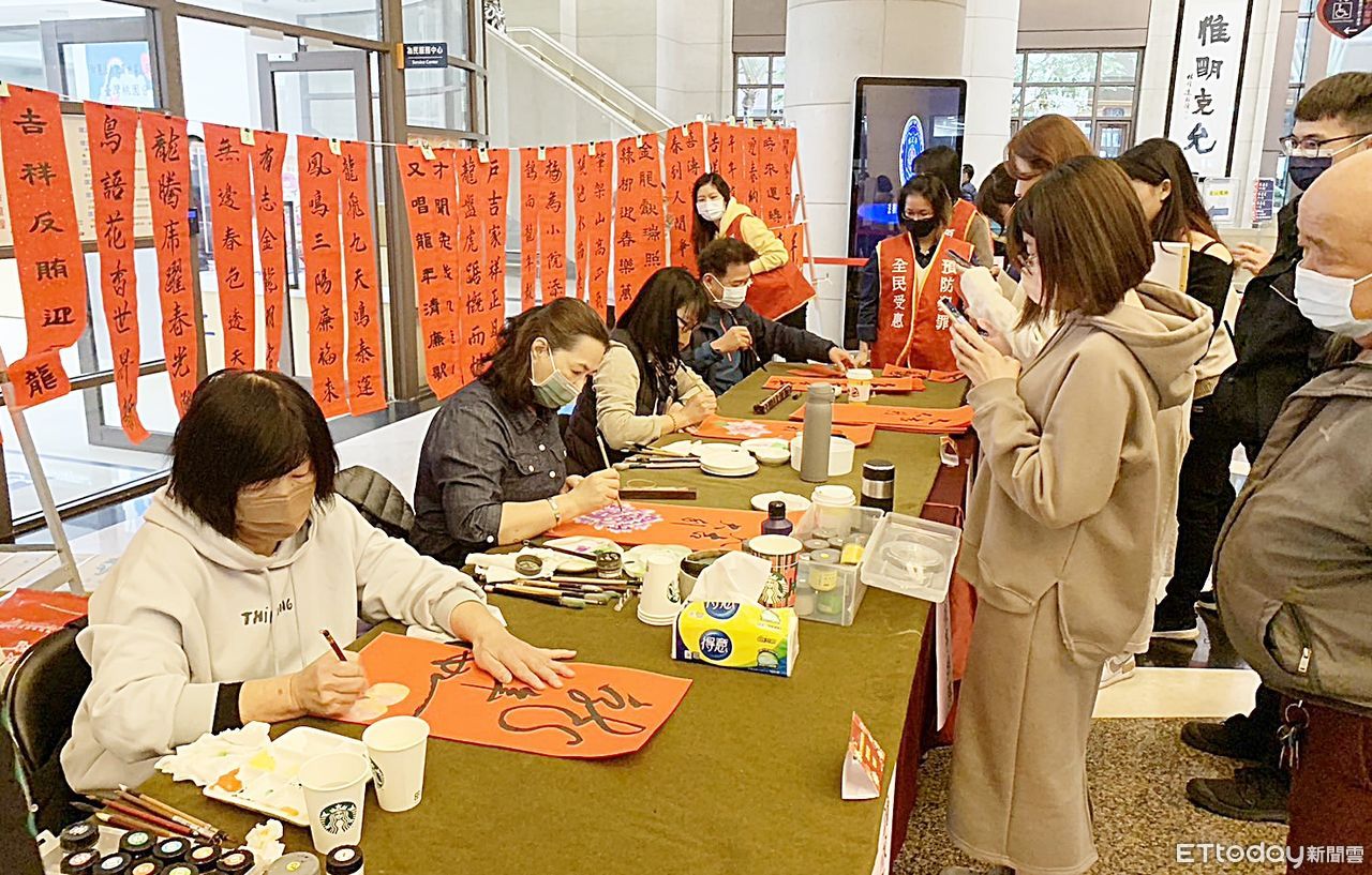 ▲桃園地檢署今天舉辦歲末舉辦春節關懷弱勢活動,一樓大廳舉辦現場揮毫與繪製彩繪春聯,提供民眾免費索取。(圖/記者沈繼昌攝)