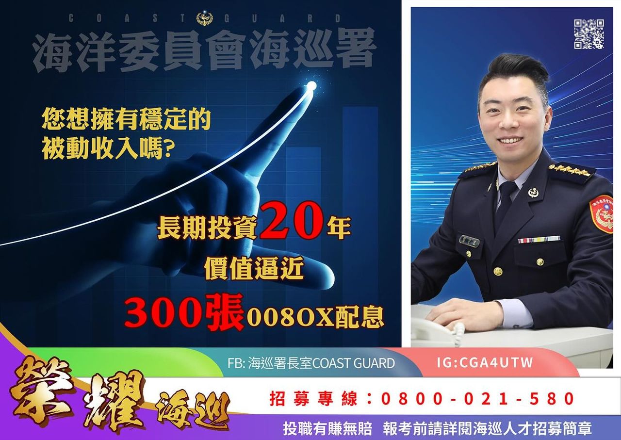 近期臉書粉專「海巡署長室 Coast Guard」貼出徵才文案,內容以投資角度,指出ETF配息跟月退俸的比較,邀請加入海巡長期投資。網友看了紛紛大讚超有哏,連正牌分析師也現身留言。