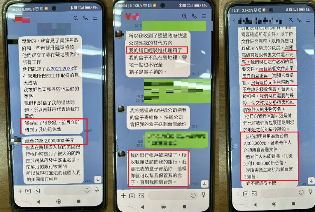 老哏還是被騙了!彰化一名年約60歲王小姐,與一名網路自稱「蘇丹軍醫」的男子墜入情網,還跟她說即將退休要到台灣跟她一起生活,但有一個裝有200萬美金的退休金包裹被海關查扣,要她代繳300萬元贖回,她一聽立刻到銀行匯款,所幸被機警行員識破,通報員警攔阻,這才驚覺原來被騙了,戰地戀情也因此夢碎。