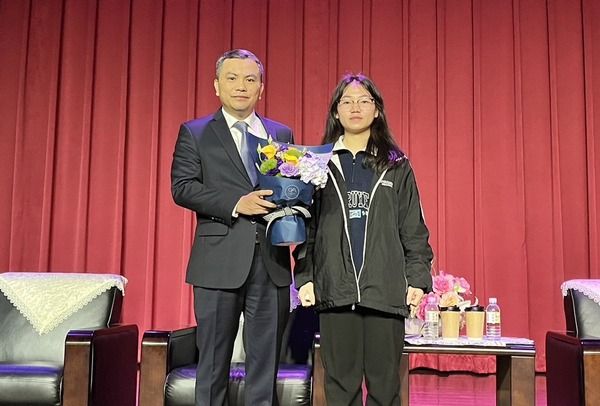 ▲越南學生代表獻花致意歡迎。(圖/開南大學提供)