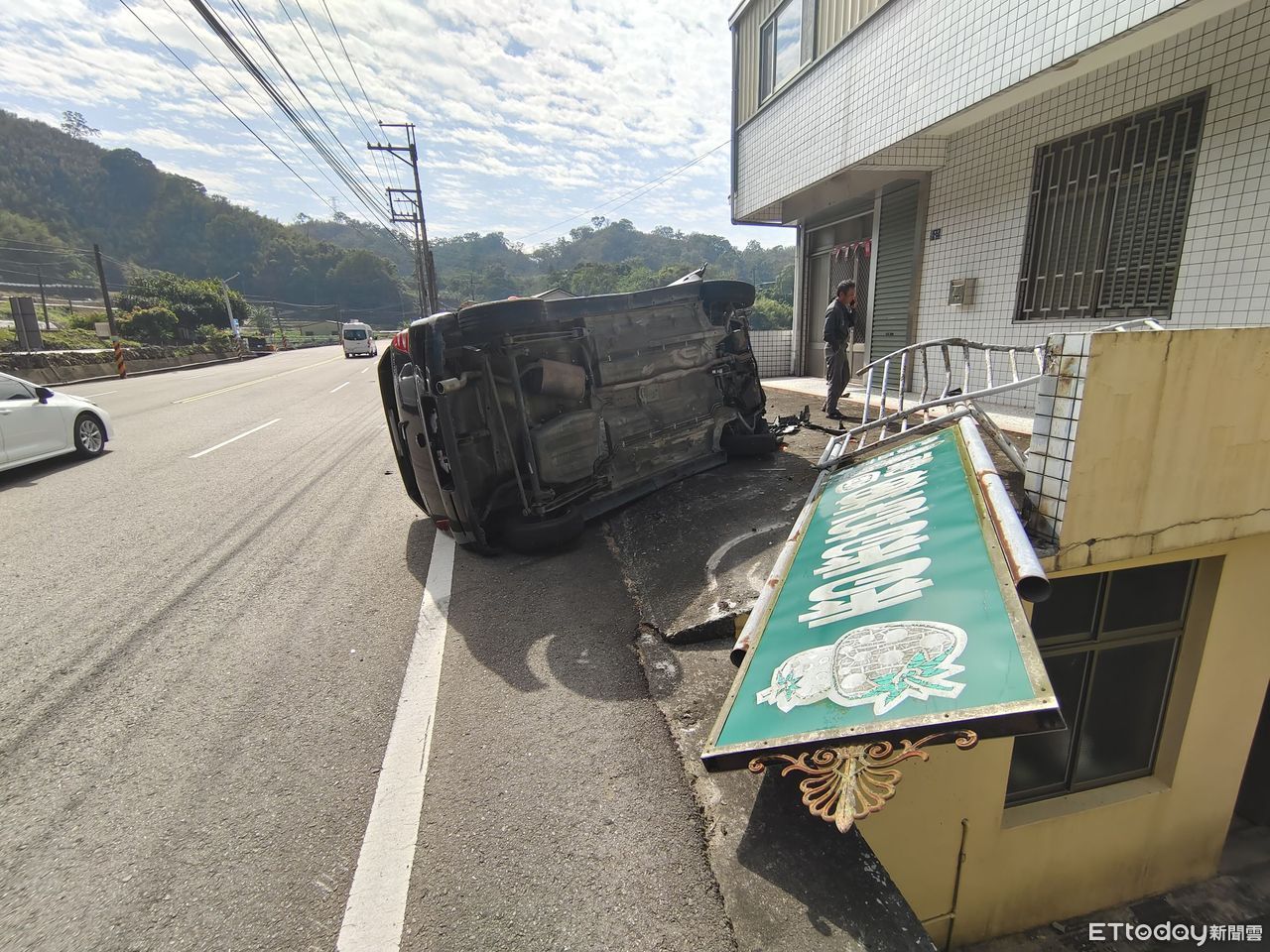▲台3線苗栗獅潭路段自小客車自撞路邊招牌後側翻,駕駛輕傷送醫,62歲女駕駛疑似吃感冒藥後精神恍惚釀禍。(圖/記者蔡文淵翻攝,下同)