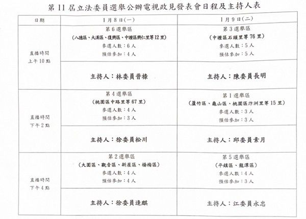 2024年立委選舉,桃園市六個選區共有26人參選,1月13日舉行選舉投開票。桃園市選委會7日表示,立委電視政見發表會8日第二、四、六選區舉辦,第1、3、5選區則於9日舉辦,政見發表會將於桃園市有線電視第三公用頻道及YouTube同步直播,歡迎市民朋友收看。