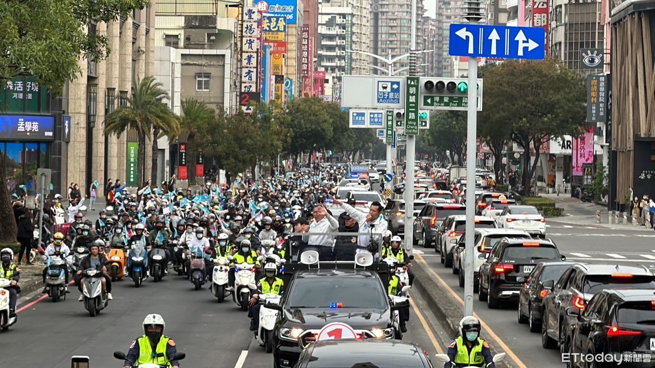 ▲柯文哲高雄車掃下午場,拉出長長「貪食蛇」車隊。(圖/記者袁茵攝)