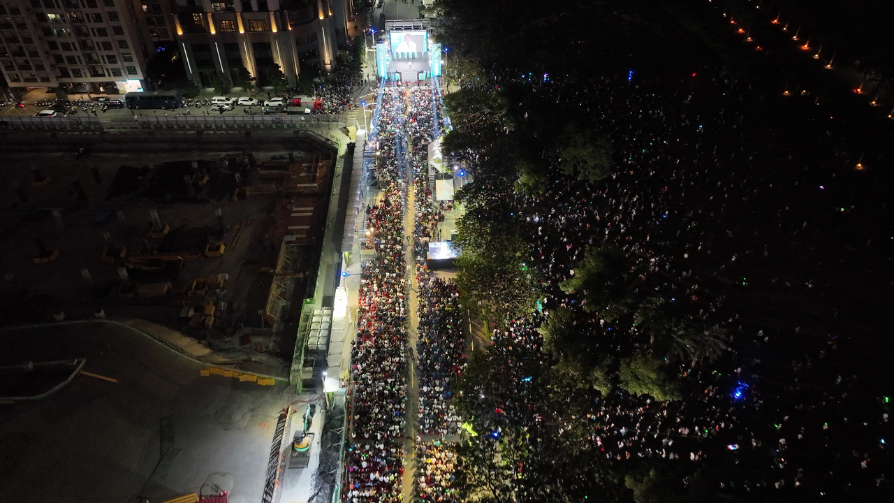 民眾黨總統候選人柯文哲7日在高雄捷運凹子底站旁邊進行造勢,開放入場約1小時就坐滿椅子,人潮溢出到一旁公園,最終民眾黨喊出現場8萬人、直播最高同時12萬人在線收看,柯文哲大進場則花了將近13分鐘;稍早民眾黨也釋出空拍圖,場面壯觀。