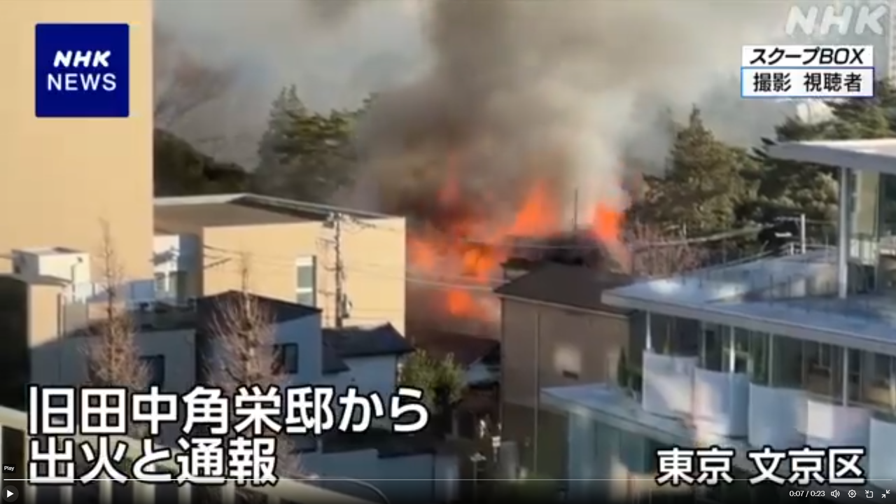日本東京都文京區目白台1丁目8日當地下午3時許發生火警,地點為前首相田中角榮舊宅邸「目白御殿」,火勢猛烈。消防人員已出動人力前往滅火,當局截至目前並未接獲有人受傷的消息。