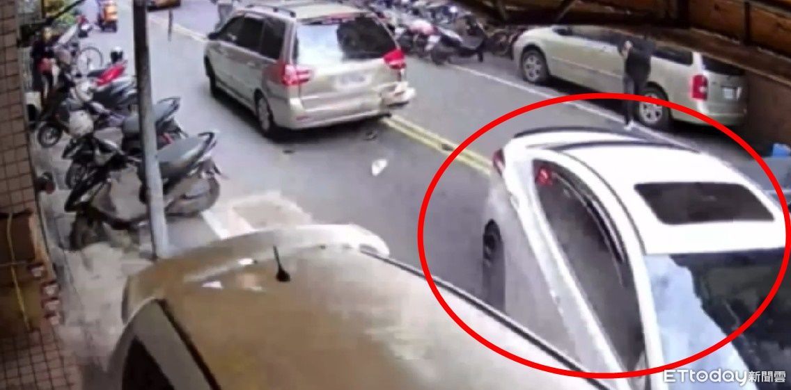 監控手撞到警方車輛屁股後,又猛力撞上停放在路邊的小客車後逃離現場,而遭波及的小客車女駕駛見愛車遭撞,則無奈打電話喊,「欸,我跟你說我車被撞爛了」。