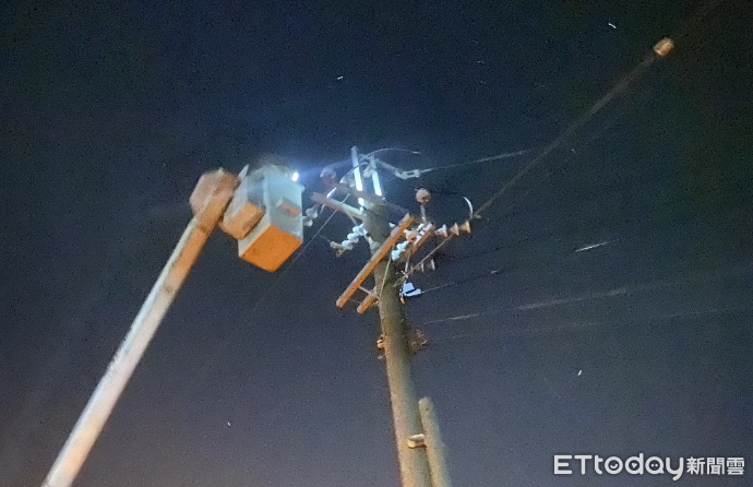 ▼台電維修人員登12米高電桿搶修。(圖/記者賴文萱翻攝)
