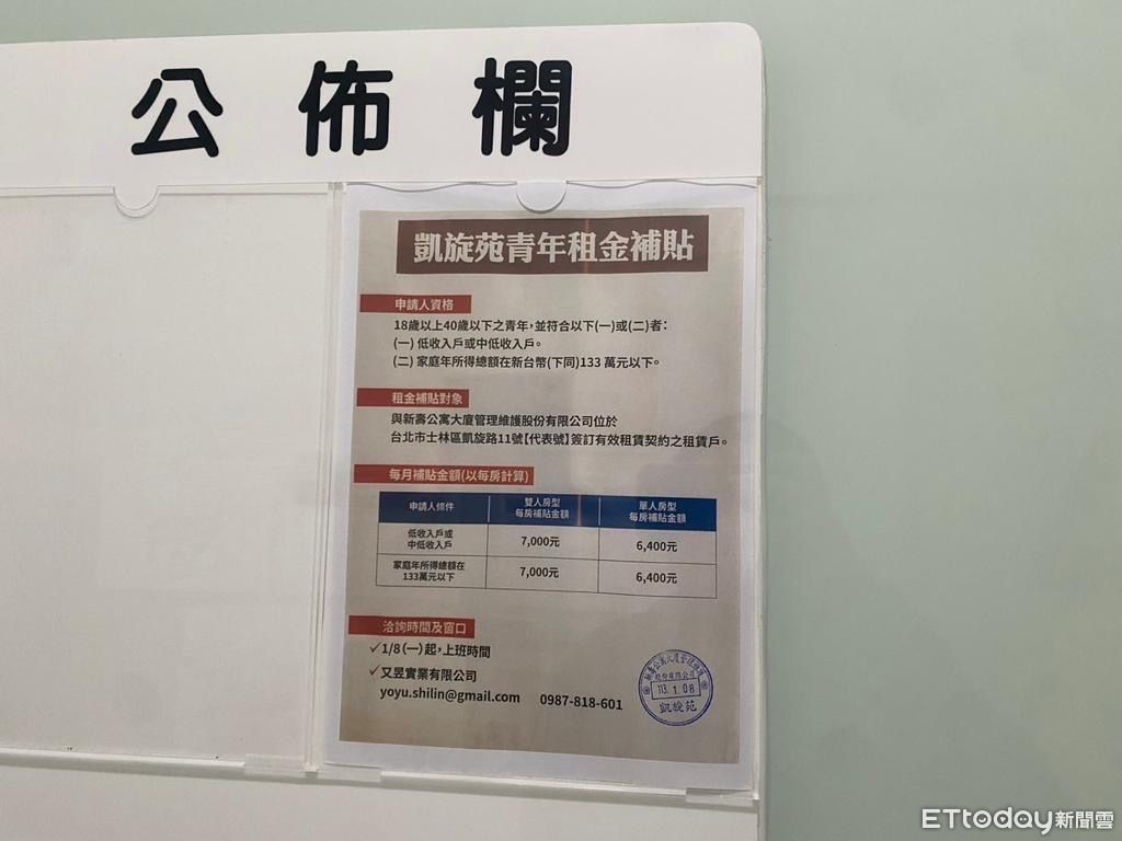 ▲凱旋苑裡面放置青年租金補貼申請公告 。(圖/侯友宜競選辦公室提供)
