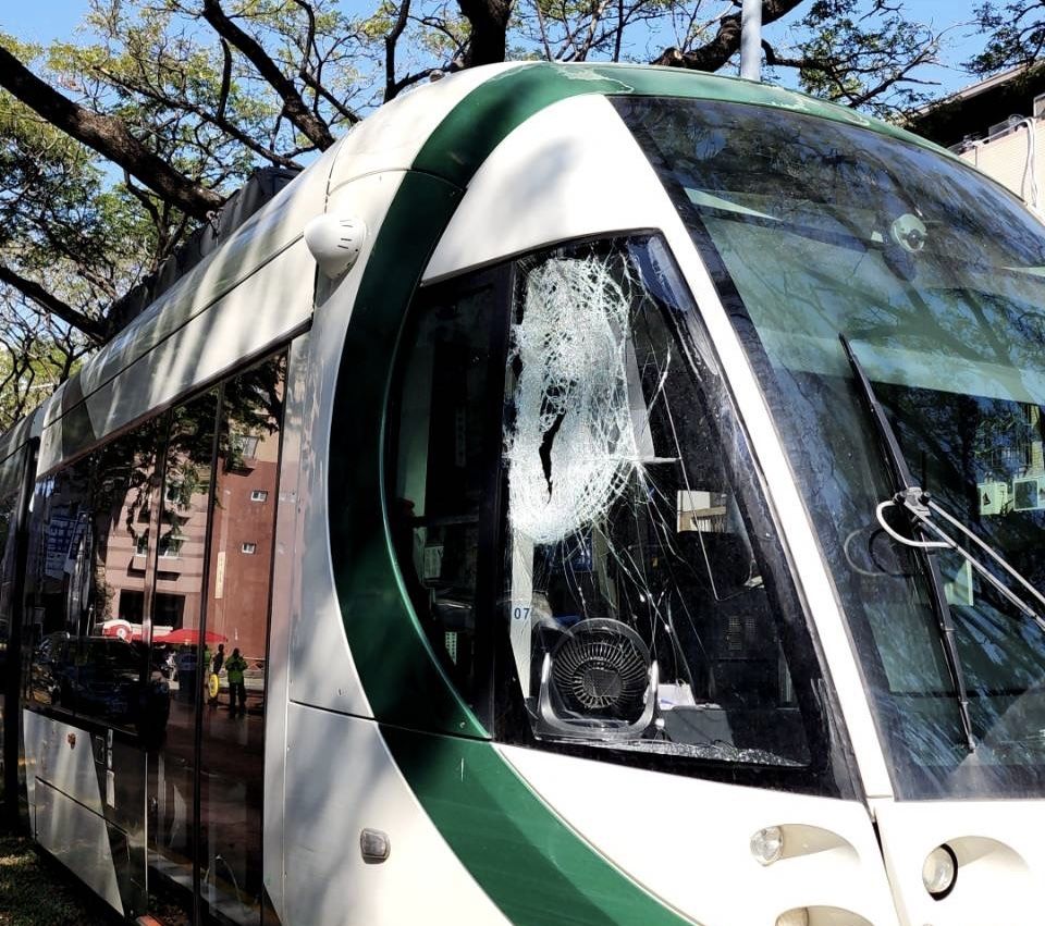 ▲高雄輕軌出事了!街口遭大卡車猛撞,車頭車窗破碎。(圖/記者賴文萱翻攝)