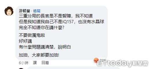 同時,他也標記常關心警察議題的國民黨立委游毓蘭;而游毓蘭也做出回應,表示「三重分局的長官是不是智障,我不知道,但是我知道我自己不是IQ157,也沒有水晶球,完全不知道你在講什麼?不要做厲鬼啦,好好講,有什麼問題講清楚,說明白,加油,大家都要加油!」