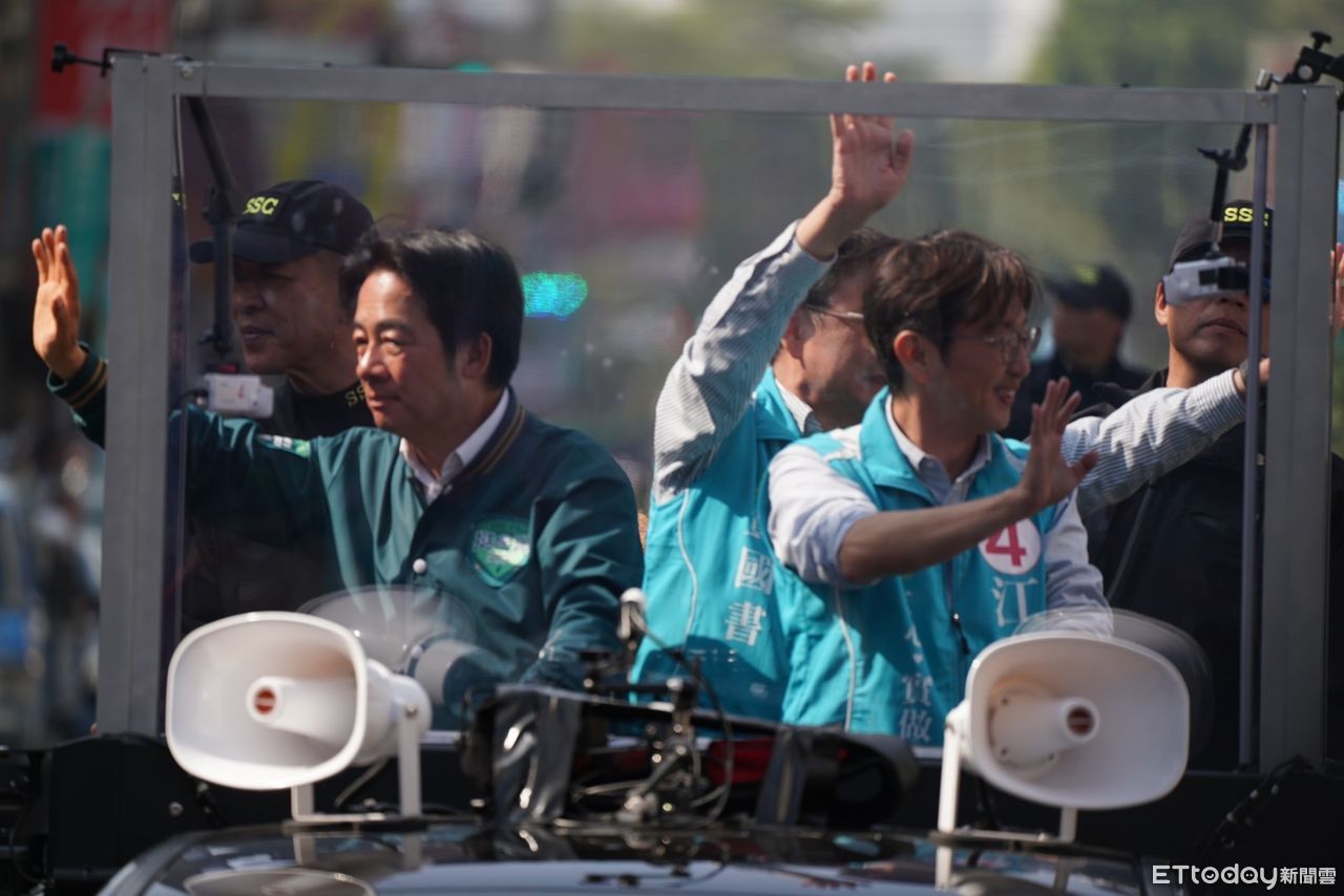 ▲民進黨總統候選人賴清德與現任立委黃國書合體,輔選台中第六選區立委候選人江肇國,陪同車隊掃街,高喊「成功交棒」。(圖/江肇國競總提供)
