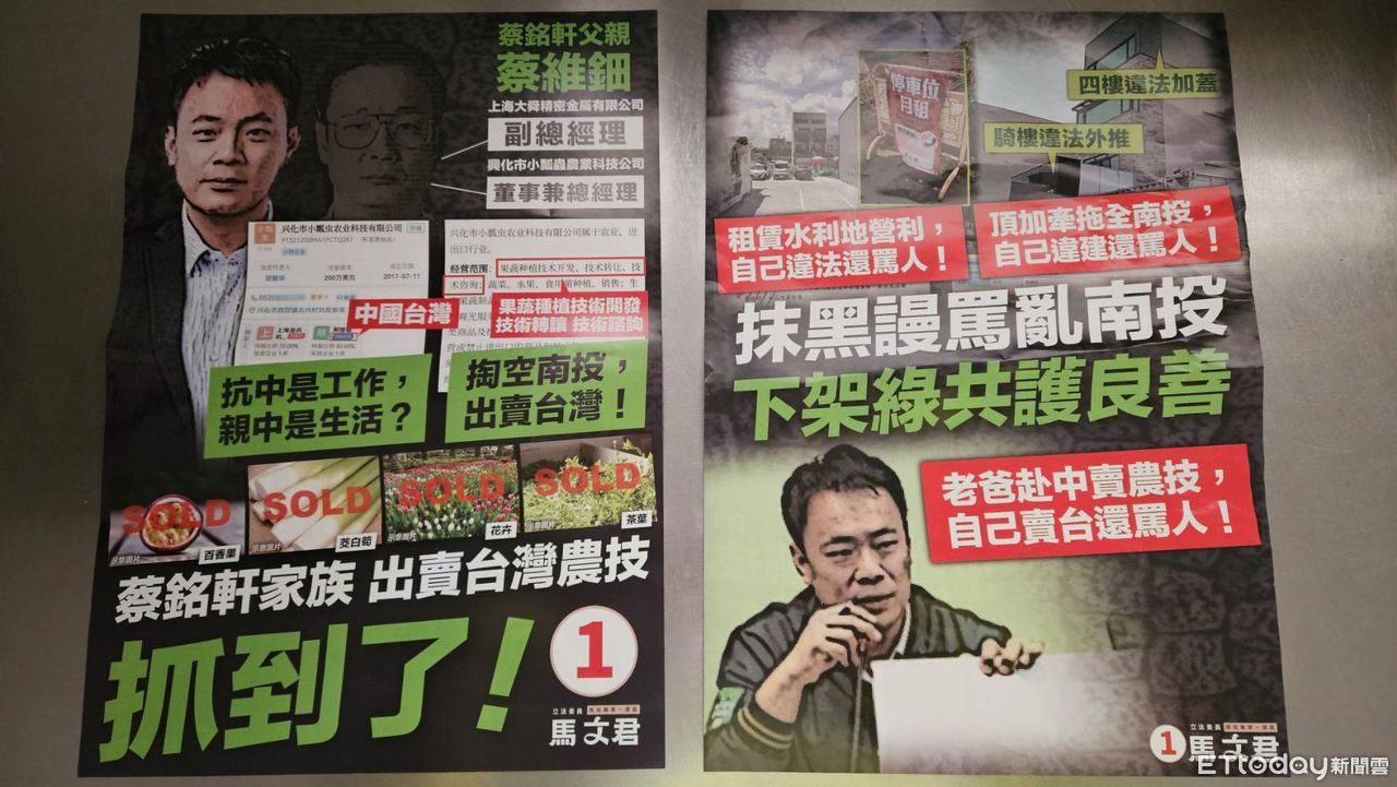 總統立委大選後天登場,涉入國艦洩密案而遭批親中賣國的國民黨南投縣第一選區立委馬文君,其陣營近日發放最新廣告傳單文宣,直指綠營對手蔡明軒的父親於中國大陸高額投資農業生技公司,涉嫌將台灣農業技術輸出對岸,痛批「假抗中、真賣台」;蔡銘軒對此嚴詞駁斥,澄清其父僅為該台商公司幹部和受薪勞工,也未與台灣有業務往來,今日也提出告訴。