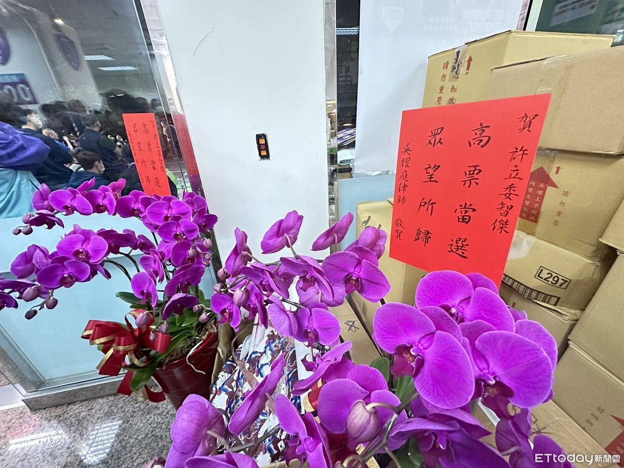 ▲高市鳳山區立委許智傑雖尚未宣布當選,但恭賀花籃已到。(圖/記者陳宏瑞攝)