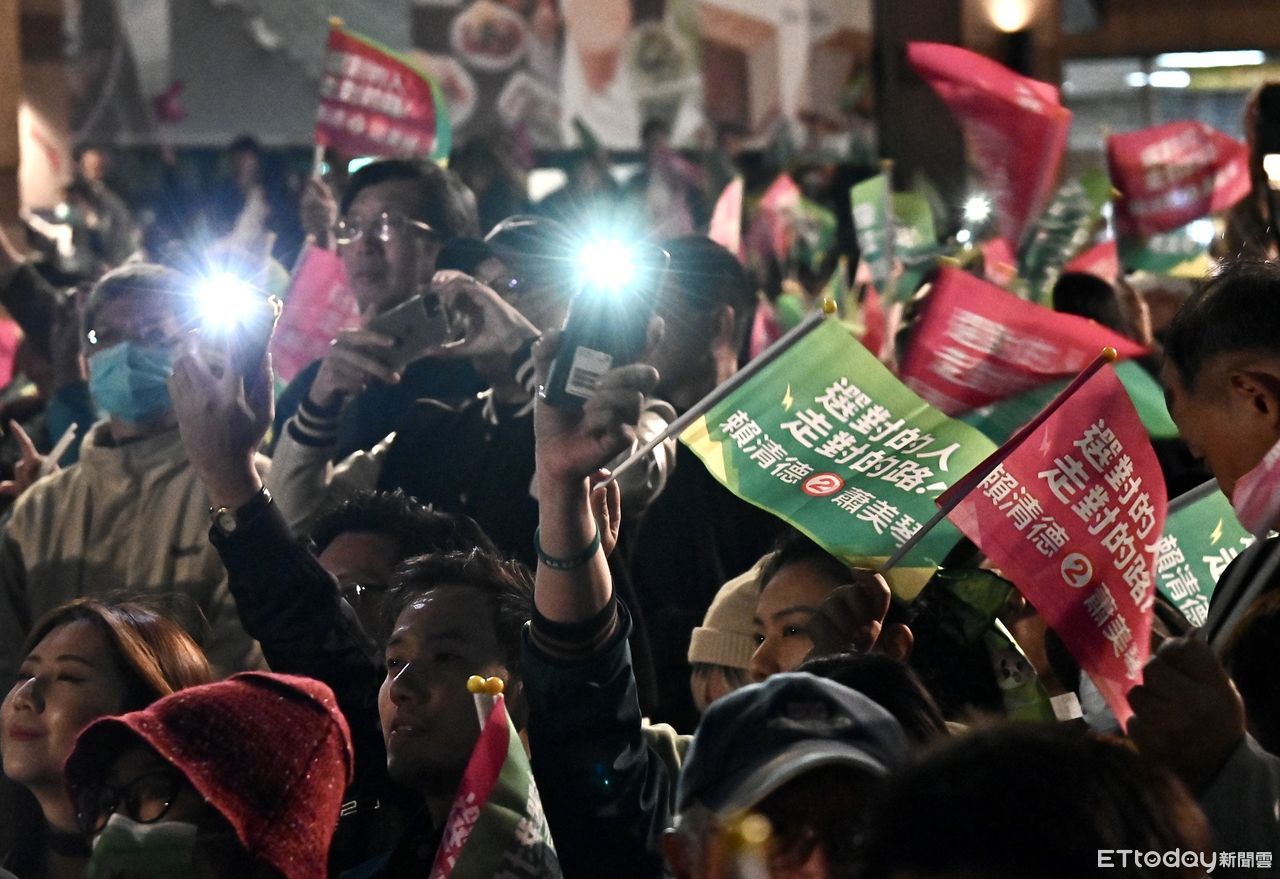 ▲大選開票之夜,賴蕭配票數持續領先,現場群眾情緒高昂。(圖/記者李毓康攝)