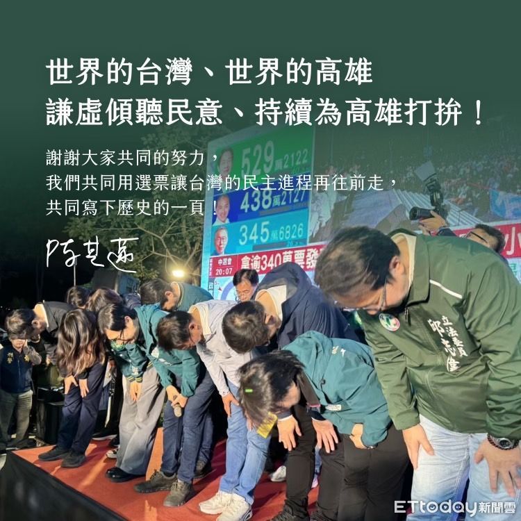 陳其邁並感謝市民朋友,共同支持讓民進黨八席立委全部當選,他跟當選的民進黨立委們會更謙虛努力,傾聽民意,持續推動高雄成為世界的高雄。