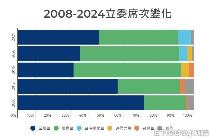 2024大選結果出爐,立委選戰部分,未有政黨取得過半席次,國民黨重返立院最大黨,113席共拿下52席,民進黨則拿51席,民眾黨獲8席,另2席一為具國民黨籍但以無黨籍身分參選的苗栗縣立委陳超明,另一位為盟友無黨籍山地原住民立委高金素梅。回顧我國自2008年立委選制改為單一選區兩票制後,16年來的時間各政黨勢力也有明顯變化。