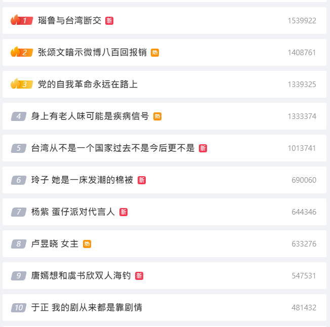 大陸微博以「瑙魯(台譯:諾魯,下同)與台灣斷交」為關鍵詞,迅速在消息傳開後便衝上熱搜榜第一位,同時,排行第五的則是大陸外交部長王毅在訪問非洲期間強調的,「台灣從來不是一個國家,過去不是,今後更不是!」引起大陸網友熱議。