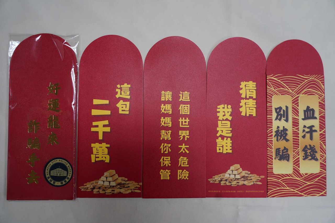 新竹市警察局為加強宣導全民防詐騙,提高長者識詐的警覺性,以及推廣教育宣導駕駛人在路口應減速慢行、停讓行人,特別在農曆春節前以「反詐騙、交通安全」為主題,設計印製10款紅包袋,紅包袋上創意獨特的文案,例如「這包二千萬」、「猜猜我是誰」等雙關標語,讓民眾直呼「好有創意」。10款紅包袋可於指定日期現場領取,也可在竹市警察局臉書參加抽獎獲得。