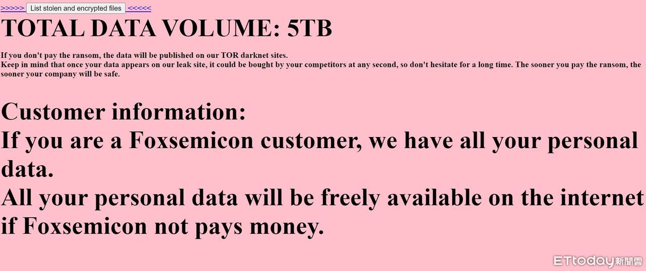 鴻海集團旗下半導體設備大廠京鼎公司(3413TW)驚傳遭駭客挾持官網、揚言已盜走多達5TB容量的內部資料加密,要求付贖否則在暗網兜售,更威脅京鼎員工與客戶將受連累,引發科技業議論。鴻海資安主管今(17日)下午將與京鼎人員,到調查局台北市調查處製作報案筆錄,釐清遭駭來源與實際損失狀況。