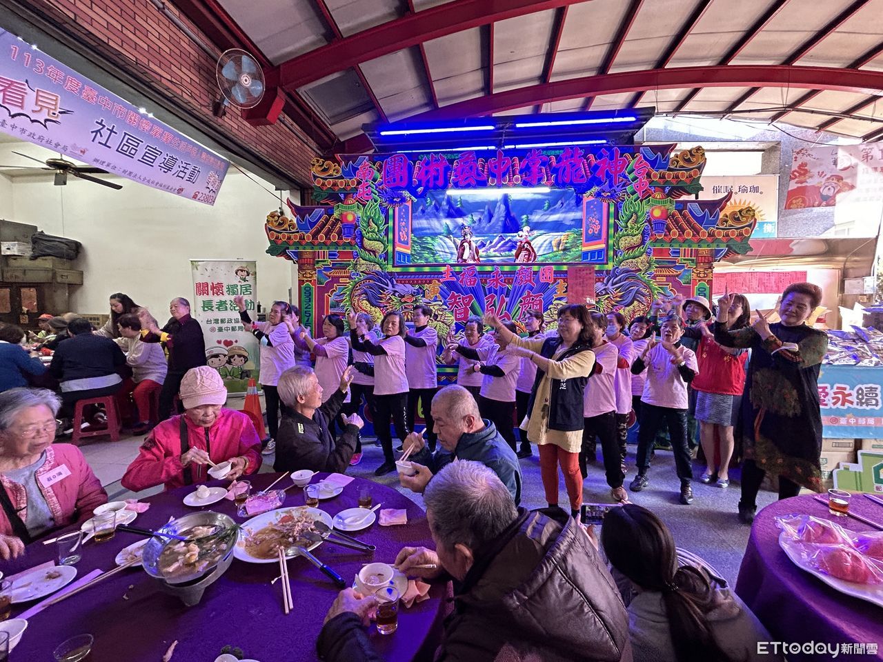 全成基金會昨(16)日於南屯區田心福德廟廣場席開29桌,邀請社區獨老、長照需求家庭及銀髮志工一起圍爐互拜早年,並在布袋戲助興以及大跳K-pop舞在網路爆紅的春社老網美賀歲熱舞下、重溫戲棚下呷澎派熱鬧時光。