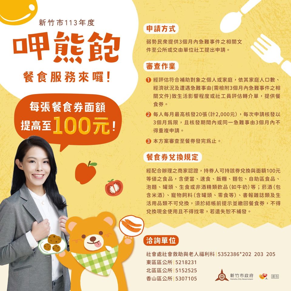 新竹市政府社會處長黃佳婷表示,為照顧弱勢孩童,市府與300多家愛心店家合作,推動「呷熊飽」餐食補助計畫,依民眾需求核發每張面額100元的餐食券,讓民眾依地緣方便至四大超商、早餐店、便當店、麵包店及生鮮超市等地,兌換熟食、便當等餐食以獲得基本飲食需求,平均每年服務逾5,000人次。另外,為了讓學童方便兌換,市府也積極媒合愛心合作店家,擴增兌換據點,歡迎店家加入愛心商家行列。