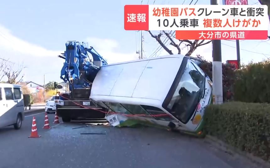 根據《大分放送》報導,大分市下郡南的一條縣道17日下午2時半左右發生嚴重車禍,一輛載有8名幼稚園幼童的娃娃車不知為何與另一輛吊車發生衝撞,隨後翻覆撞上電線桿。