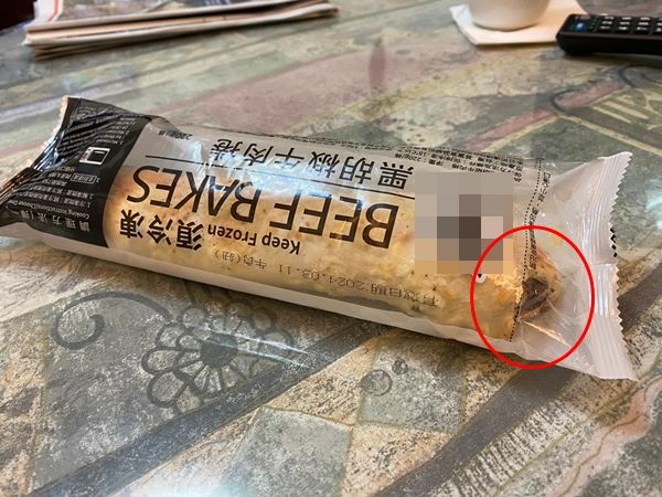 從照片當中可以看見,這支牛肉捲的外包裝雖然沒有拆開,但裡面的牛肉捲頂端缺了一角,且缺失的部分剛好是圓弧狀,就像是被咬了一口。