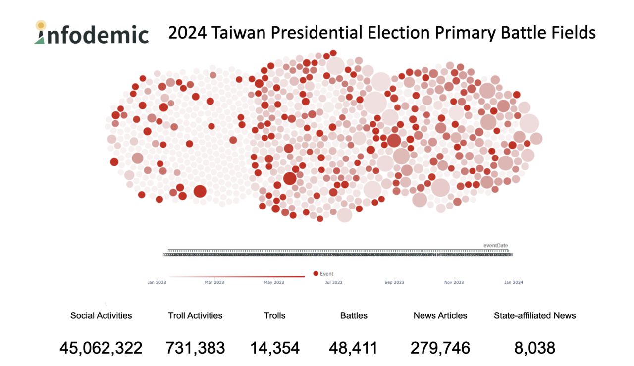 台灣人工智慧實驗室17日舉辦「台灣大選認知操作觀察討論會議最終場」,總結10項從本次台灣總統大選獲得的經驗。實驗室從去年(2023)1月開始監測各大社群平台,分析4506萬多次的社群平台互動,發現73萬多次的互動是由協同帳號群所操作,且歸納出約1萬4354的協同帳號,產生多達4.8萬個輿論戰場。