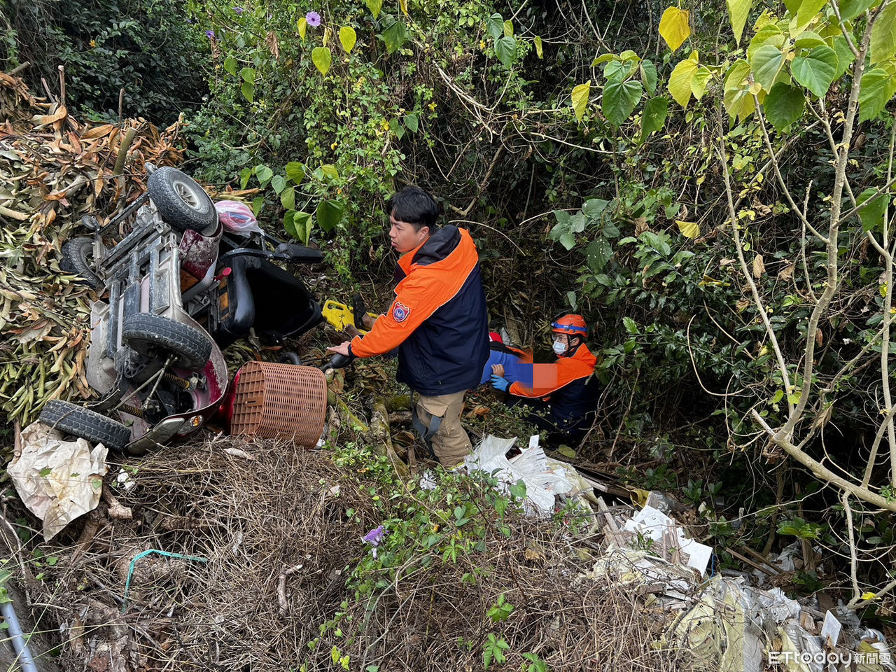 ▲1名身障人士,駕駛電輪電動車行經官田區南119線,不慎撞上路邊坑洞石頭,導致車輛失控,人車翻覆邊坡,官田消防隊將該男子搶救送醫。(圖/民眾提供,下同)