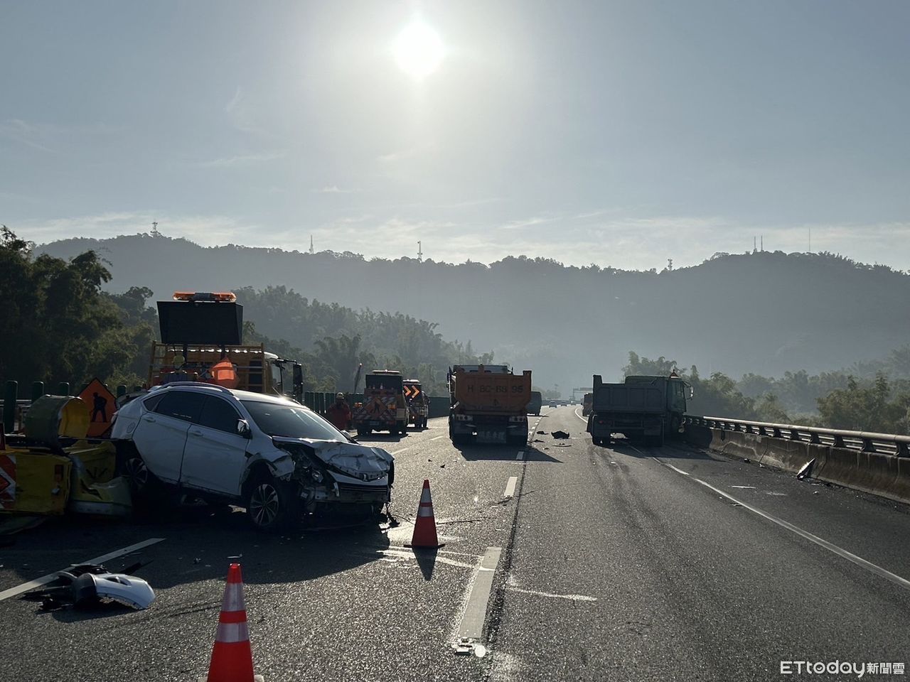 第五公路警察大隊指出,36歲李姓女子駕駛自小客車行駛內側車道,疑因未注意車前狀態,撞擊施工緩撞車後,又遭後方行駛內側車道之25歲黃姓男子駕駛的自小客車撞擊,黃男車輛隨後偏向外側,再遭行駛外側車道48歲尹男駕駛的聯結車撞上。