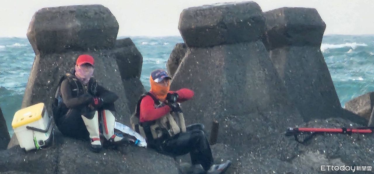 ▲台南市七股區國聖燈塔沙洲最北側消波塊,19日下午傳出有2名釣客受困該處,七股等消防分隊8車16人前往搶救,成功平安救出脫困。(圖/民眾提供,下同)
