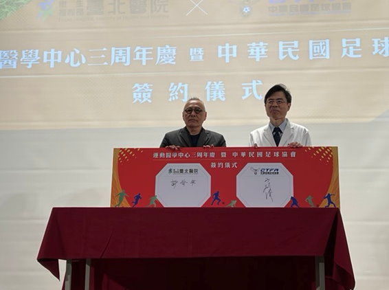 衛生福利部臺北醫院運動醫學中心成立3周年,提供運動選手專業的綠色通道,讓運動選手在第一時間有精確的診斷,進而擬定未來治療和訓練的方向,今(19)日臺北醫院鄭舜平院長與中華民國足球協會王麟祥理事長在世新大學陳清河校長、中華帕拉林匹克總會宋玉麒秘書長、新北中信特攻職業籃球隊李逸驊總教練…等人的見證下,共同簽訂合作備忘錄,臺北醫院提供綠色通道與個人化精準治療,守護中華足球代表隊,成為國家隊最堅強的醫療後盾。