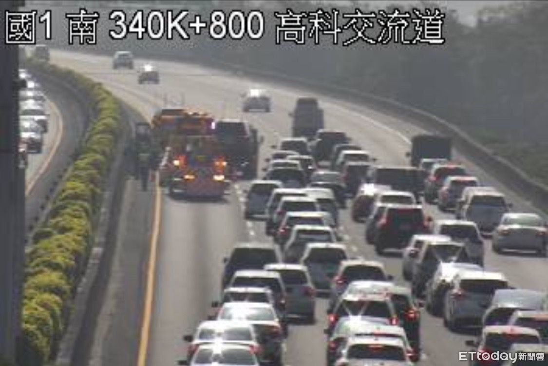 國道一號南下342.1公里高雄科學園區交流道附近,今(20)日上午11時許發生一起4輛車的追撞車禍,車禍導致後方車流阻塞,綿延超過5公里,已經呈現時速低於20公里的「紫爆」車況,國道警方已獲報趕到,初步發現僅是單純車損,沒有人員受傷,詳細車禍原因仍有待進一步調查釐清。